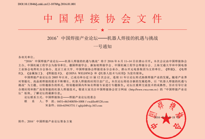 2016中国焊接产业论坛--机器人焊接的机遇与挑战一号通知