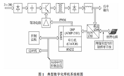 逆变电源的高响应速度为焊接控制技术提供了一个理想的平台,数字化技术在焊接电源中的应用进一步提高了电源控制技术的水平和可操作性。数字化焊接设备可分为两类,一是控制电路数字化程度高;二是具有开放式的数字化接口,可实现多信息交换的软件加载方式的数字化智能控制平台,如图 1 所示。目前,国内电焊机制造企业已经解决了数字化焊机产品问题,但与国外多功能数字化焊机掌握核心技术相比,我们的数字化产品在工艺技术先进性和市场认可方面尚与国外知名品牌产品有很大差距。