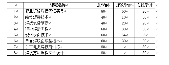 英语、高等数学、信息技术基础、工程力学、工程图学、机械工程材料、机械工程基础、电工技术及焊接电工、熔焊原理与工艺、焊接方法与设备、焊接质量控制与检验、焊接结构、焊接材料、焊接设备及自动化、焊接工程管理与预算、钢结构设计及焊接、结构生产工艺与工装、焊接安全生产等。