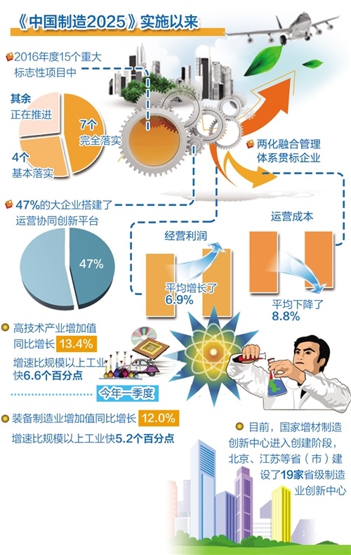 工信部数据显示,自《中国制造2025》实施以来,国家制造业创新中心建设、智能制造、工业强基、绿色制造、高端装备创新等“五大工程”扎实推进;在2016年度15个重大标志性项目中,7个完全落实,4个基本落实,其余正在推进。47%的大企业搭建了运营协同创新平台,两化融合(信息化和工业化融合)管理体系贯标企业运营成本平均下降了8.8%,经营利润平均增长了6.9%。